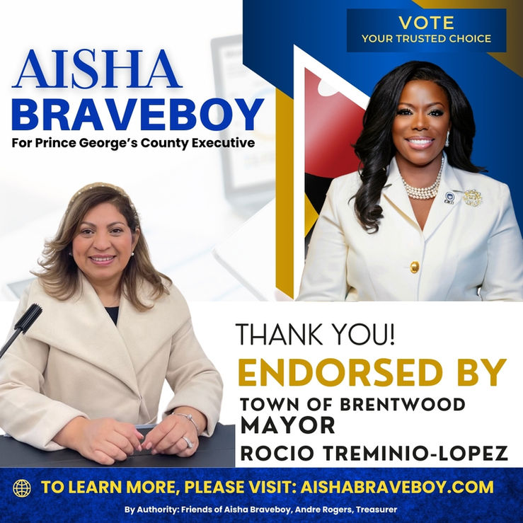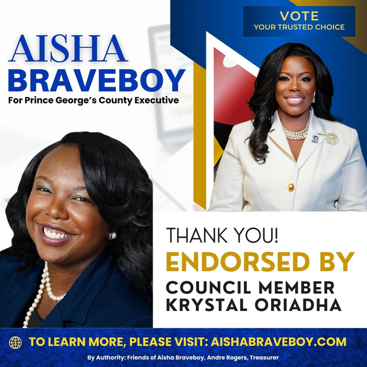 "Aisha Braveboy brings a proven track record of experience and leadership across all levels of government, she has the skills and knowledge necessary to lead Prince George’s County effectively."